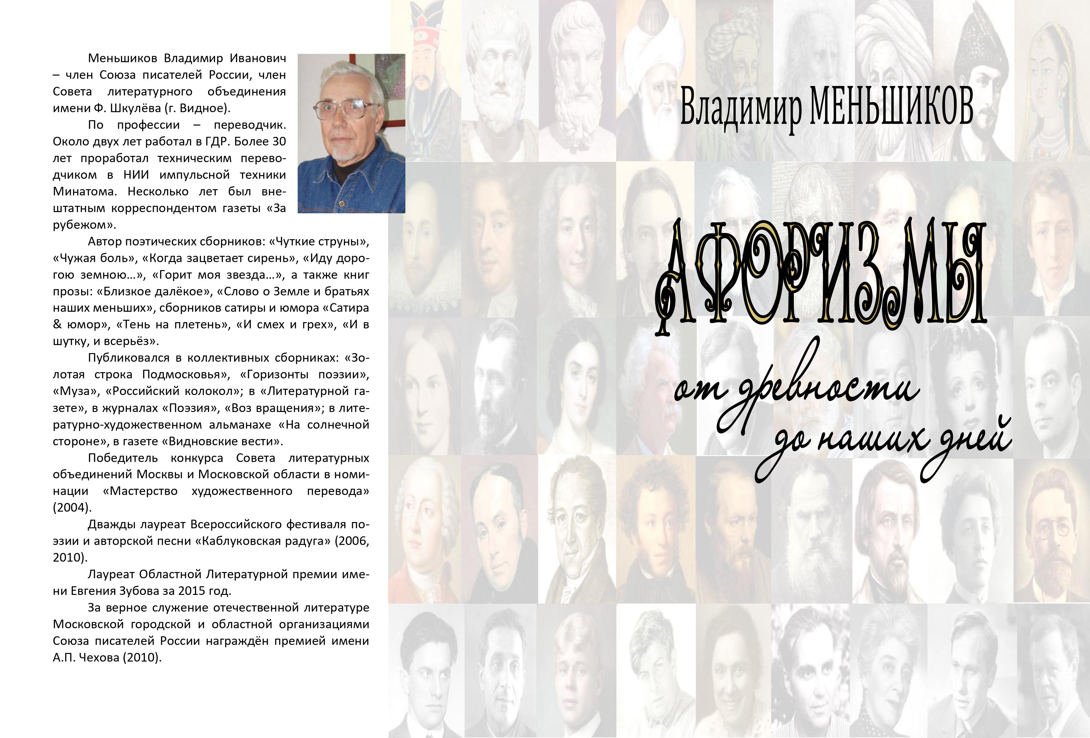 Афоризмы от древности до наших дней.:/проза. Меньшиков В.И. – М.: Издатель А.А. Зусман, 2021 – 104с.