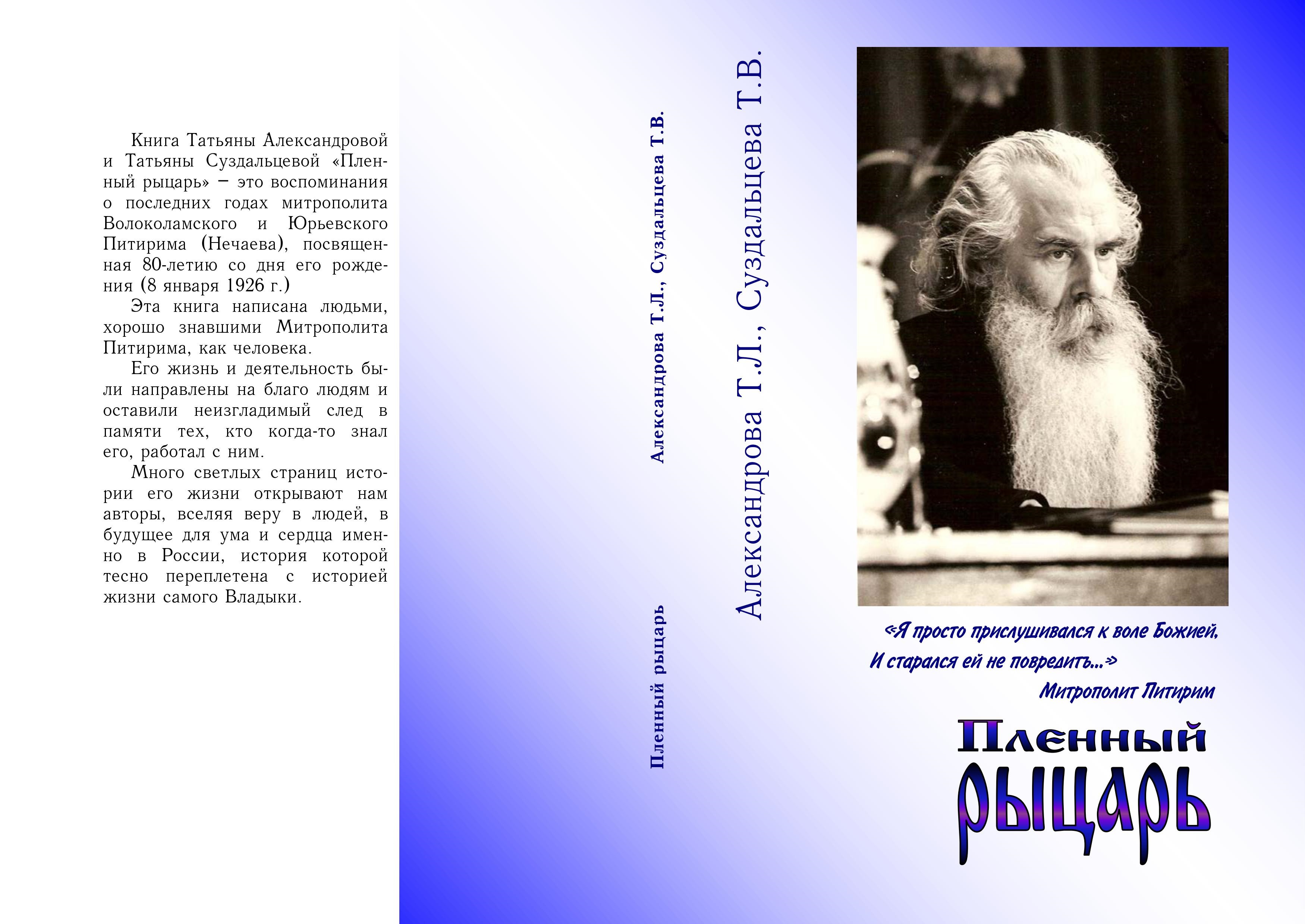Пленный рыцарь: Воспоминания о последних годах митрополита Волоколамского и Юрьевского Питирима (Нечаева).:/Проза. Александрова Т. Л., Суздальцева Т.В. – М.: Издатель А.А.Зусман, 2008–125с.