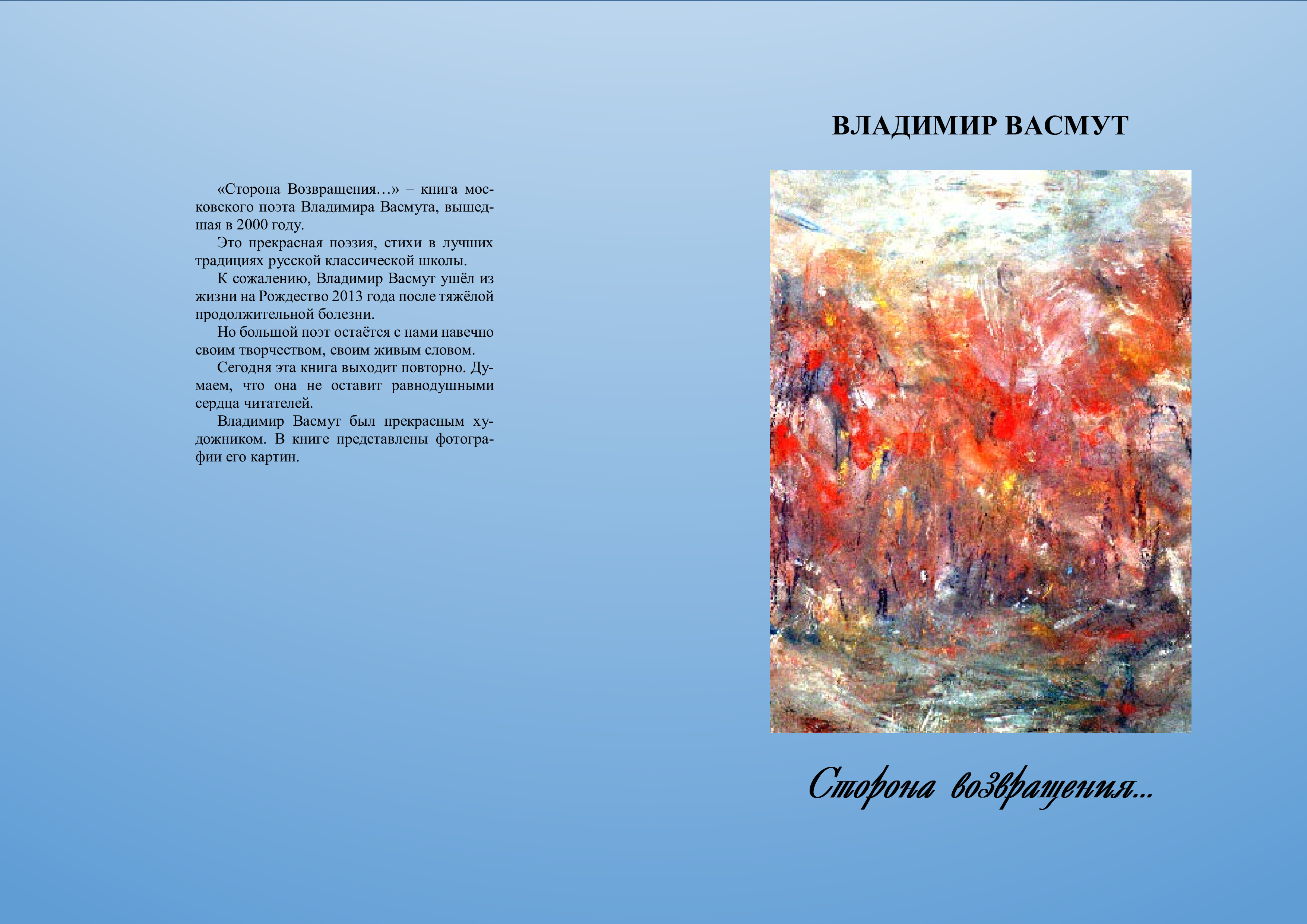 Московский художник Владимир Васмут предлагает книгу своих стихов. Её лиризм и первозданность образов найдут отклик в душе взыскательного читателя.